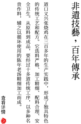 道口義興張燒雞在三百多年的生產(chǎn)實踐中,形成了獨具特色的傳統(tǒng)工藝和配方。它選料嚴格、加工精細、配料合理、安全衛(wèi)生。從原料到成品,要經(jīng)過十多道傳統(tǒng)工序,以多種名貴作料,輔之以循環(huán)使用的陳年老湯精細加工而成。因而具有造型優(yōu)美、型如元寶、豐腴完整;皮色柿紅、微帶嫩黃,色澤鮮艷晶瑩透亮;肉絲有韌勁、雞肉一咬齊茬、香味濃郁、咸淡適口;熟爛離骨,用手一抖,骨肉自行分離;無論涼熱食之,均余香滿口的風味特色,受到各地廣大消費者的稱贊和歡迎。